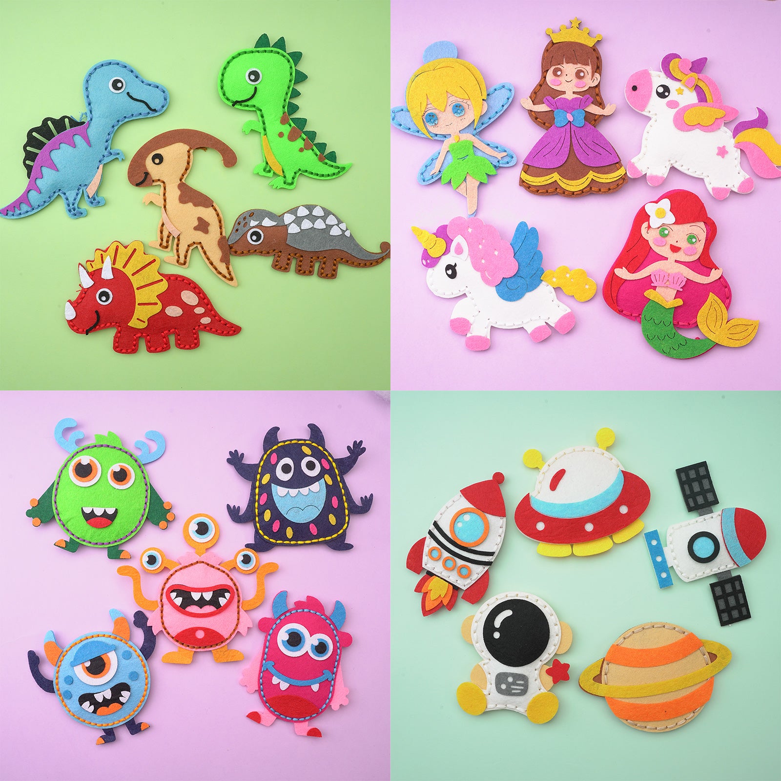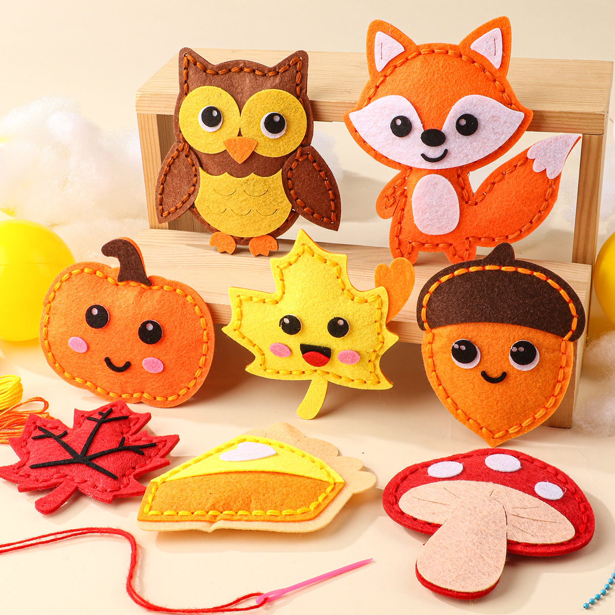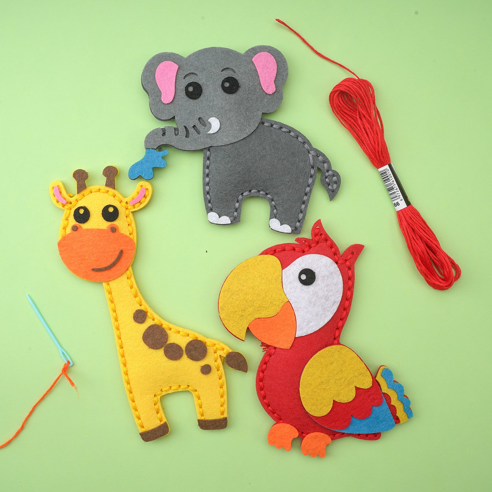 Everything your child needs to start right away: 5–8 pre-punched felt figures, matching thread, 3 child-safe plastic needles, stick-on decorations, stuffing, hanging chains, and simple step-by-step instructions.